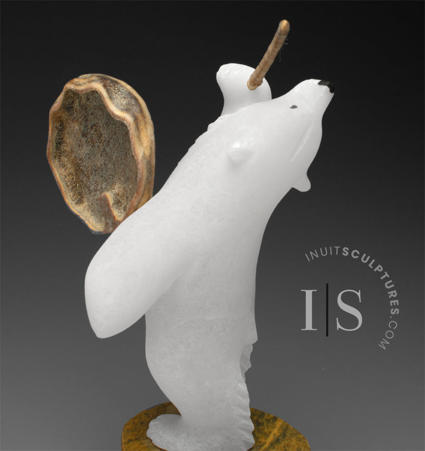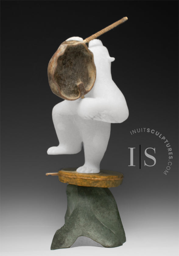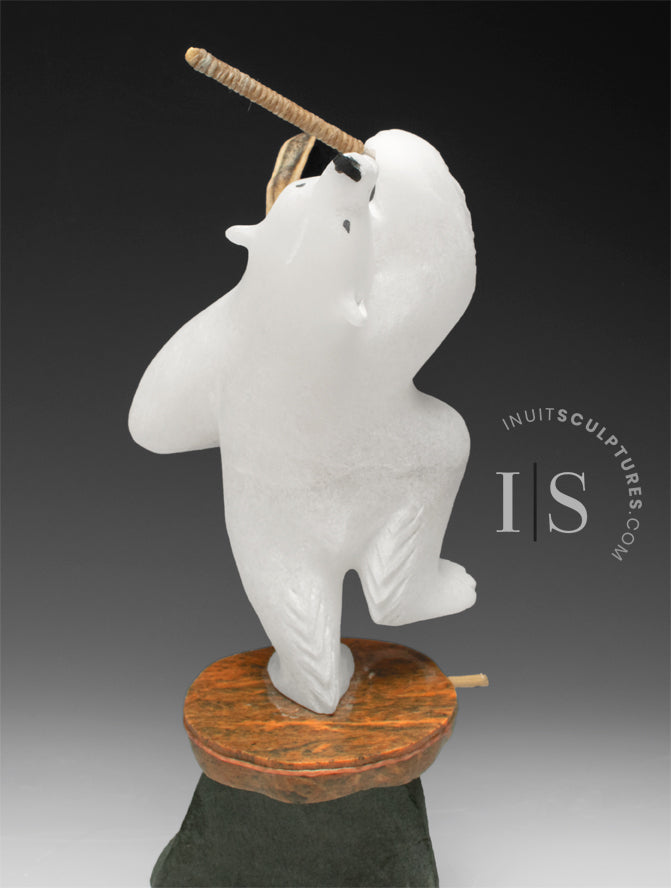The clarity of the flawless white stone bear allows us to appreciate every nook and cranny of this energetic polar bear Drum Dancer.