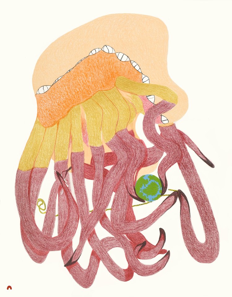 Ashoona's brilliant and beautiful depiction of the world being saved not by humans, but by the earth's other species.