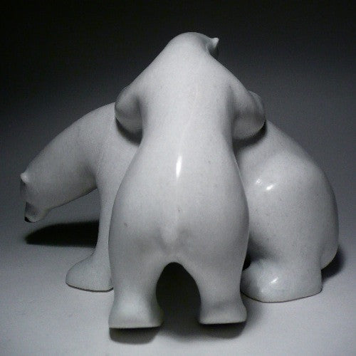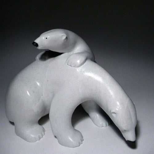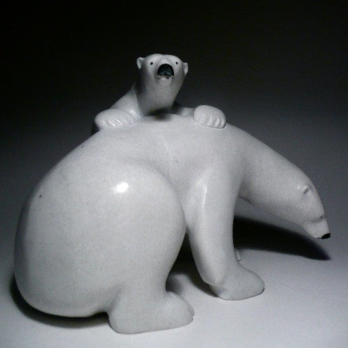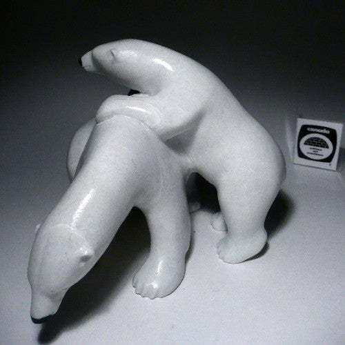 This is a series of electrifying white polar bear Inuit sculpture by Internationally renowned Inuit artist Lew Phillip from Iqaluit. He specifically made this and several other bears we have in our store for the Northern Lights festival held in Ottawa Canada back in February 2012. This is an exhibition piece from a well recognized artist, thus making it a very strong investment.