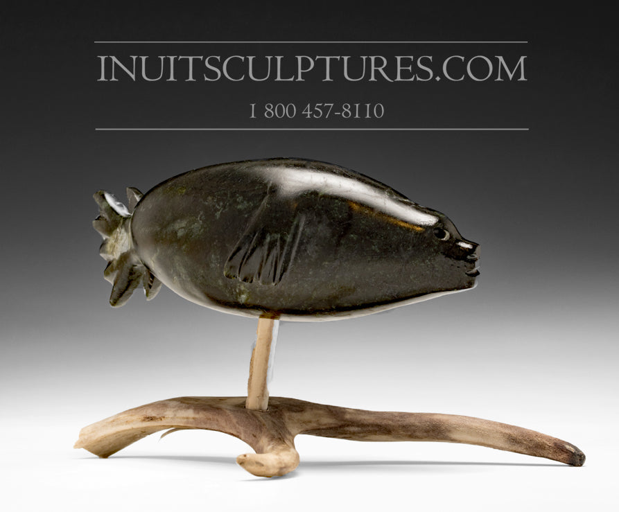 This is a beautiful rendition of a swimming seal by Louis Uttaq. The piece is elevated on an antler allowing the viewer to observe the seal as it speeds through the water like lightening.