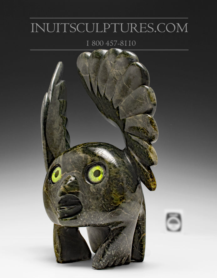 This is a gorgeous Owl in a deep darkish grey serpentine stone with lightning electric green eyes. One of our favorites by Toonoo. The beautiful stone, movement and innocence send positive waves throughout our gallery.