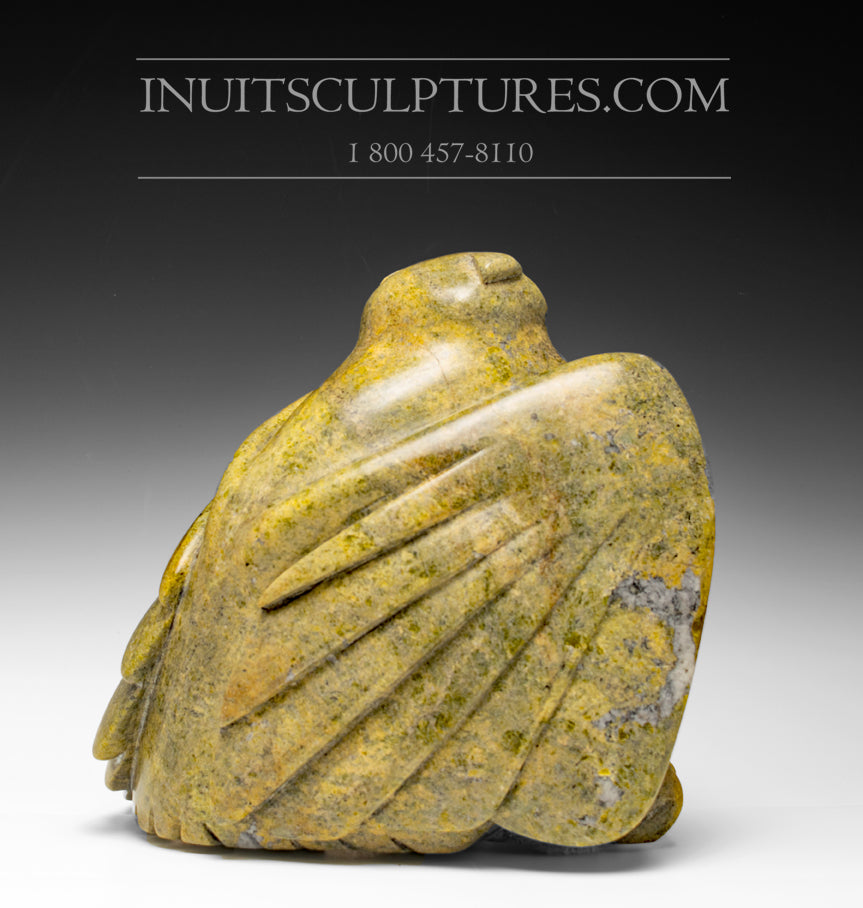 Joanasie often sculpts a Mother owl protecting her chicks under her large spread wings or he shows us a solitary owl, squatting on the ground with folded wings and huge innocent eyes.