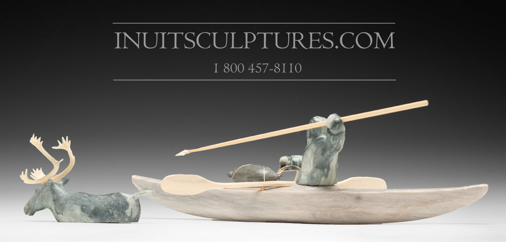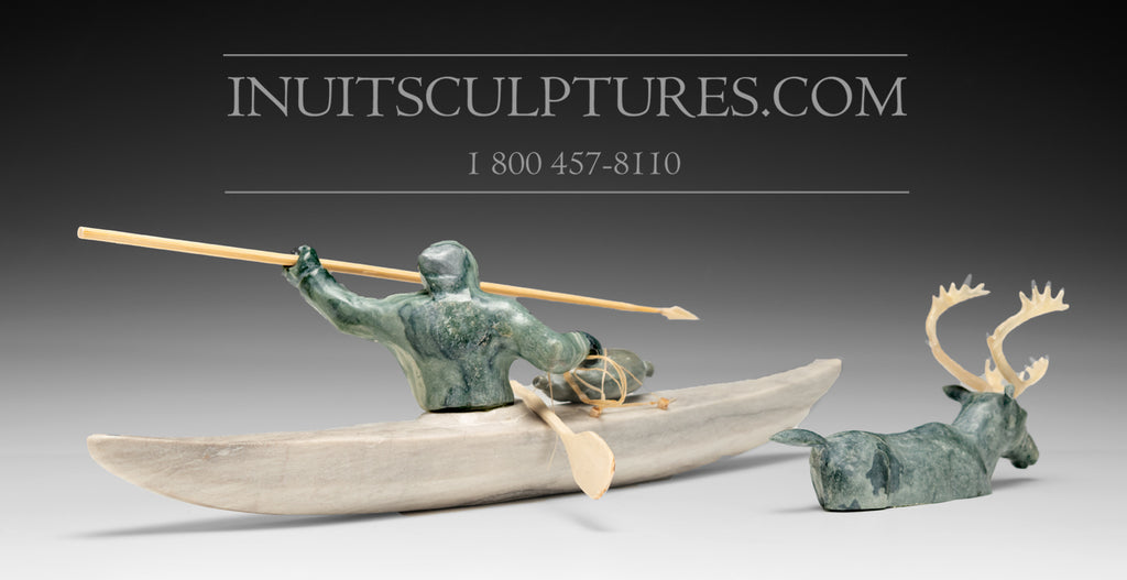 Master carver Bobby Anavilok crafts, with artistic poise, a gorgeous rendition of an Inuk and a kayak hunting a caribou. The sense of balance, crisp lines and coloration are punctuated by the inlaid eyes. This feature lends itself to a strengthened character and a prodigious intensity.