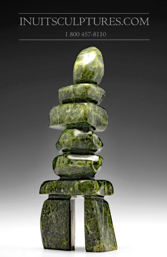 This is a gorgeous balanced Inukshuk done in a striking serpentine stone from Cape Dorset. The curves are exceptional The refined stone adds a beautiful clash between modernism and traditional style. Polished to a mirror shine.