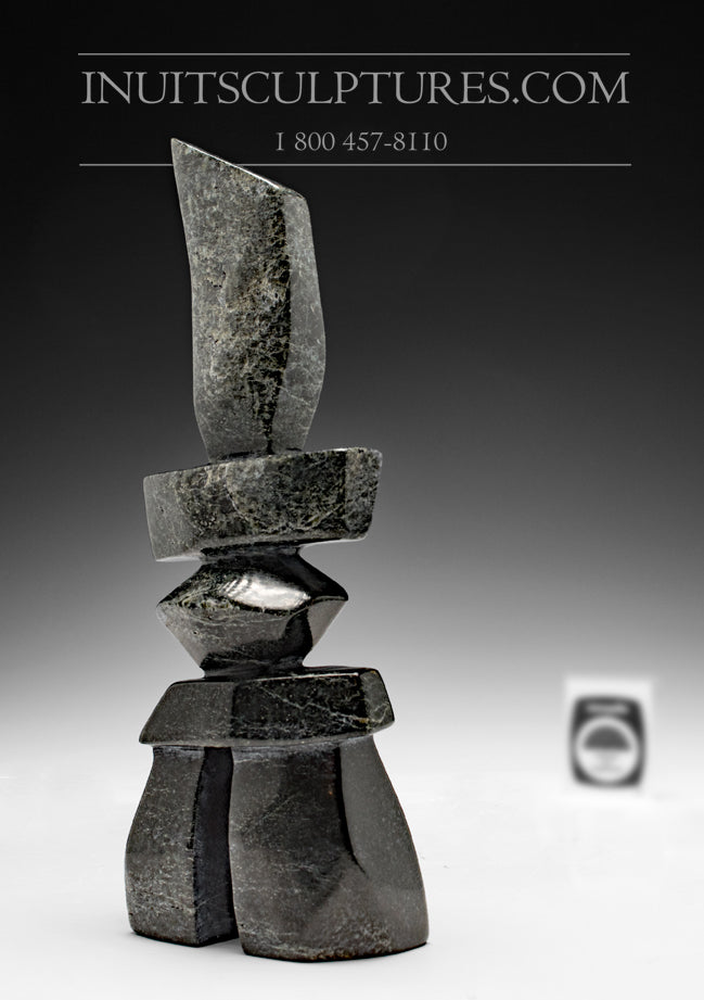 This is a gorgeous balanced Inukshuk done in a striking serpentine stone from Cape Dorset. The curves are exceptional The refined stone adds a beautiful clash between modernism and traditional style. Polished to a mirror shine.