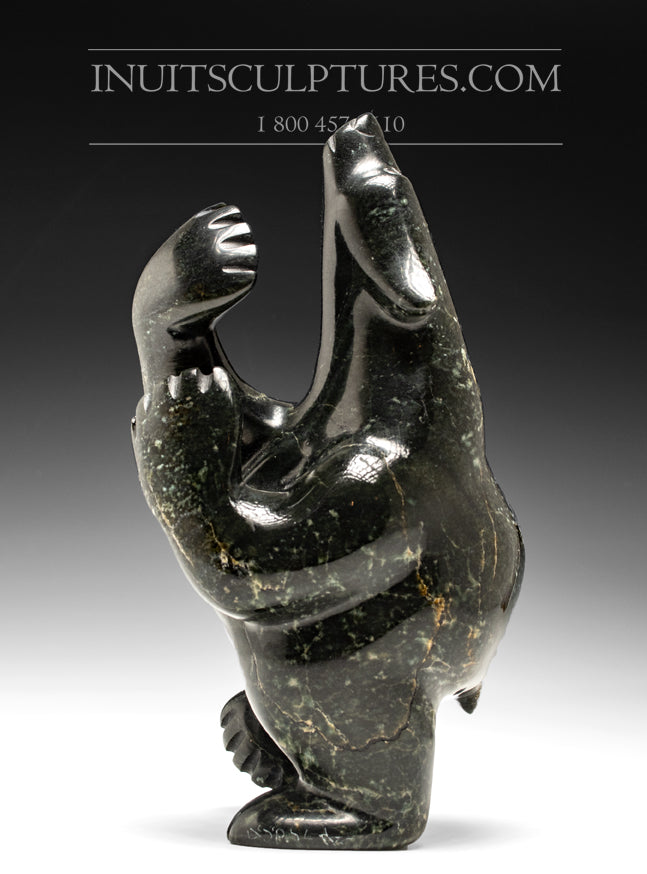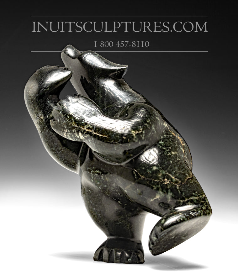 Ottokie Samayualie takes great care in choosing his stone. His carvings are made of the finest serpentine of varying green shades, and then smoothed and polished to best exhibit the lustre of the stone.