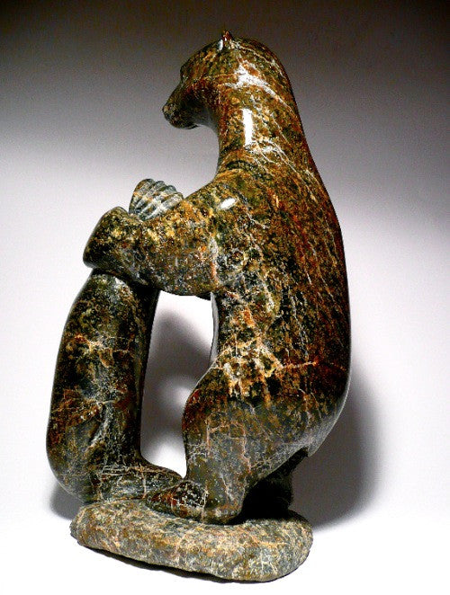 This is a spectacular and immense bear holding a seal by Simeonie Aqpiq. It was carved in Kimmirut, Nunavut.