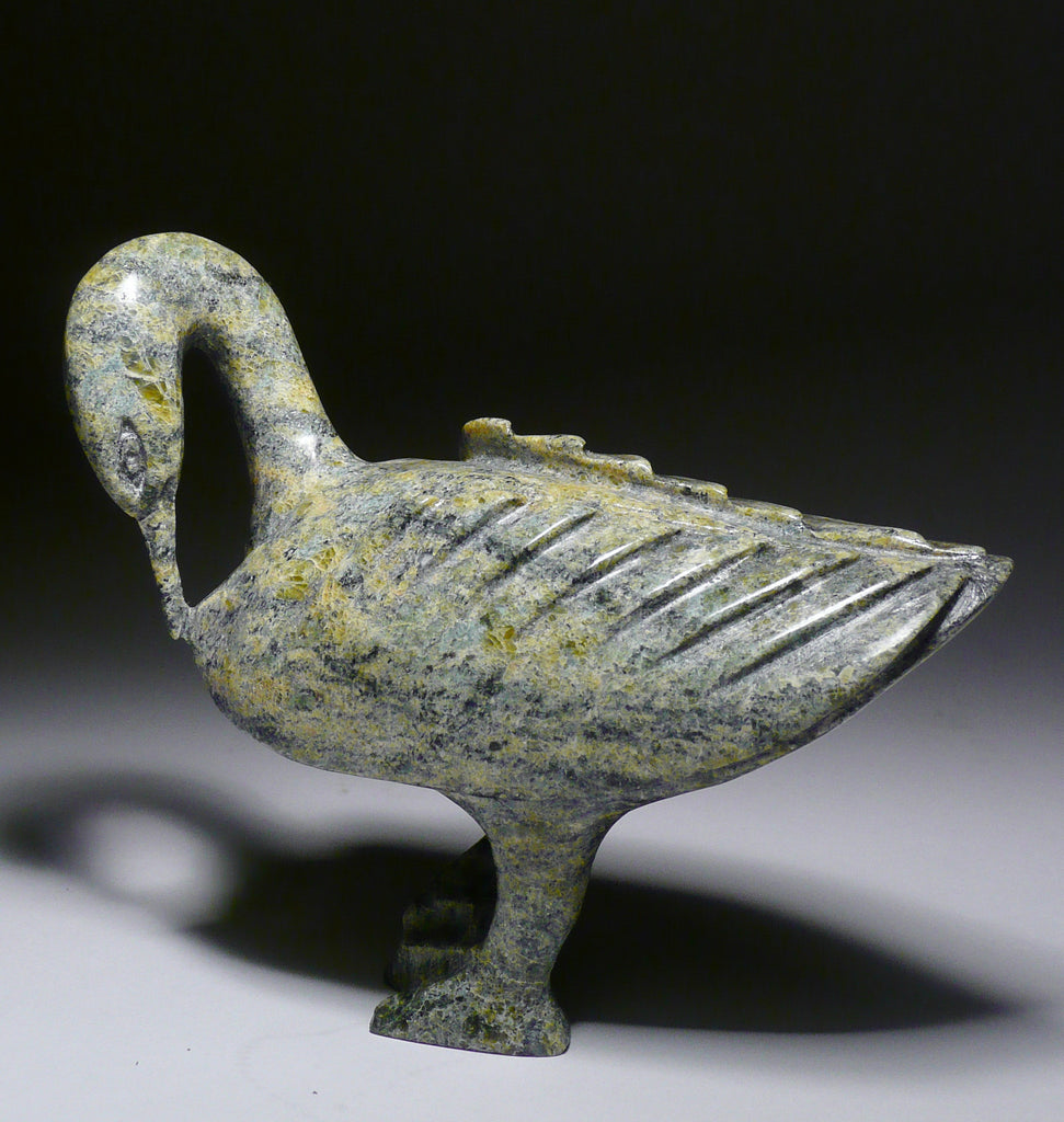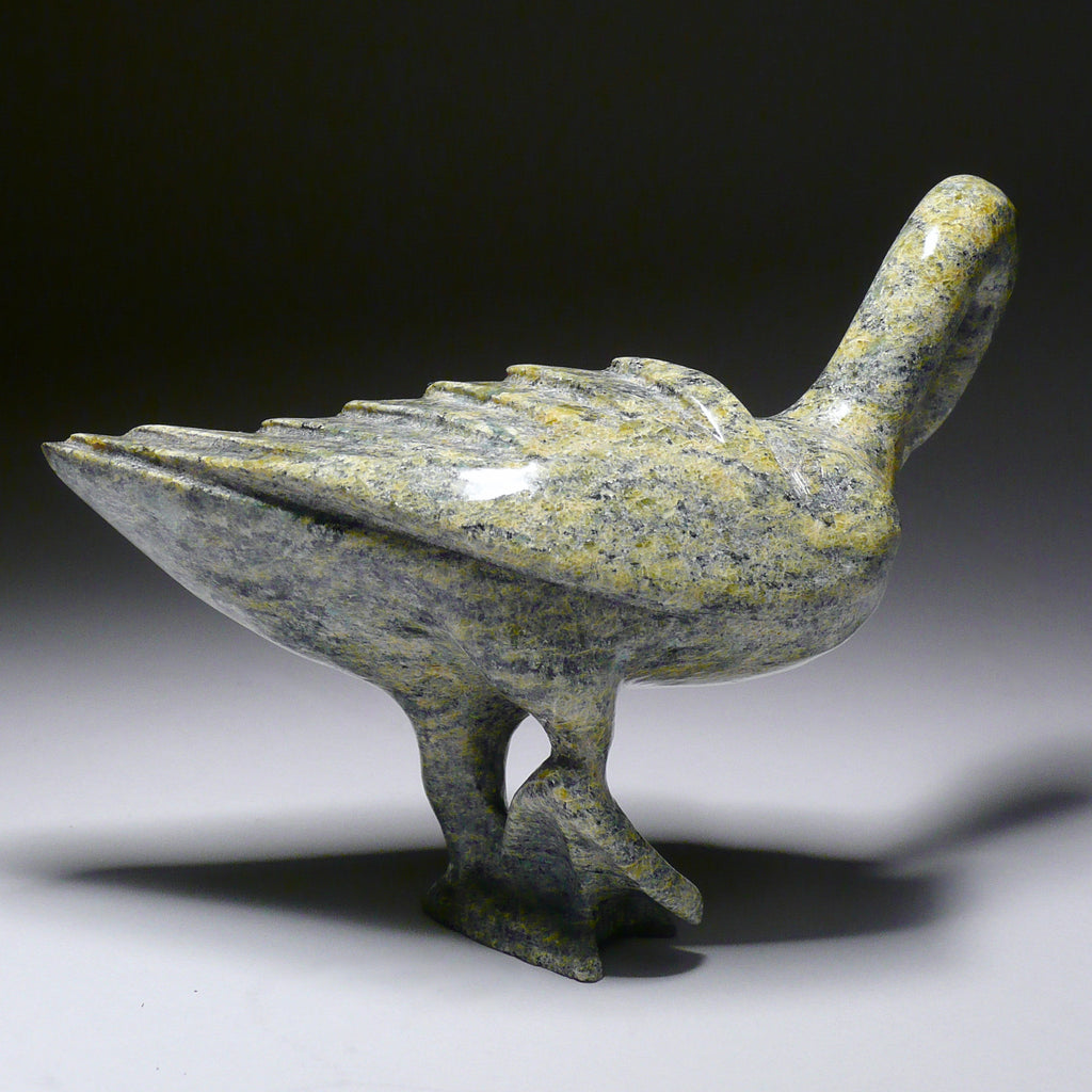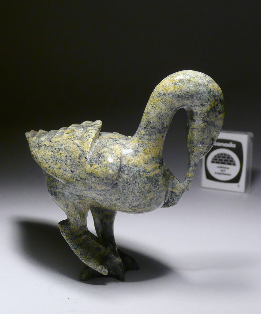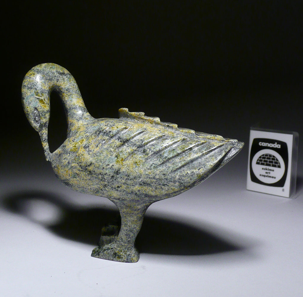 This is a gorgeous dancing goose by master Inuit carver Pudlalik Shaa from Cape Dorset. This dancing goose measures 5" wide, 4" tall. It is made out of serpentine.