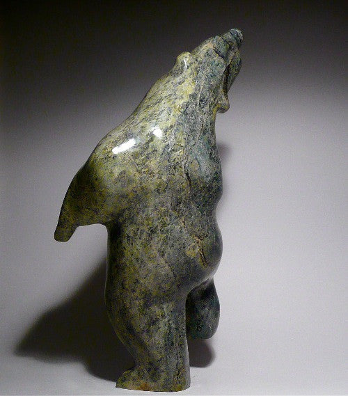 Joanie Ragee is a very well established artist and is recognized internationally for his dancing bears. His dancing bears are full of life with much movement. This is what attracts Inuit art enthusiasts to his works. Joanie Ragee prefers to carve using stone with the traditional green and grey coloration. He expresses himself mostly by allowing his dancing bears to balance perfectly while dancing on one or both legs.